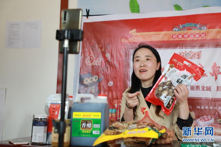 2月23日,在位于甘肃陇南市徽县的店铺中,全国人大代表梁倩娟在网上直播销售当地农特产品。 新华社记者 张智敏 摄