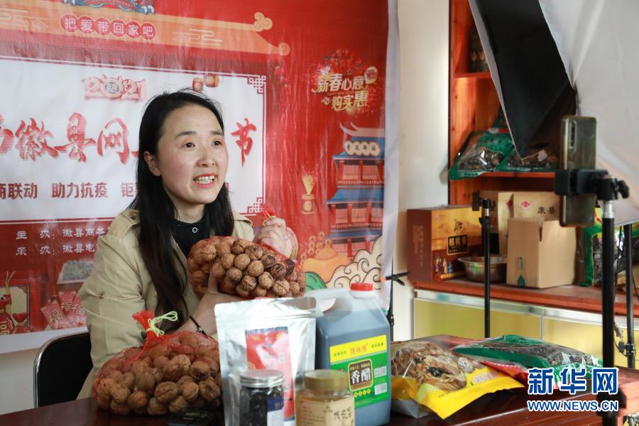 2月23日,在位于甘肃陇南市徽县的店铺中,全国人大代表梁倩娟在网上直播销售当地农特产品。新华社记者 张智敏 摄