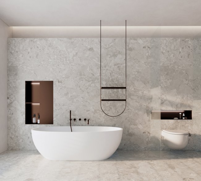 技术层面,“回归本真”并不意味着放弃创新。恰恰相反,贝利泰此次展出的产品,是其数十年釉面工艺积累的集大成者。通过自主研发的微哑光釉料技术,产品表面呈现出天然石材经过岁月打磨后的温润质感;通过多层定位施釉工艺,岩板在光影流转间展现出丰富的层次变化,却又丝毫不显张扬。这种“藏而不露”的技术美学,正是“回归本真”理念的最佳注脚。