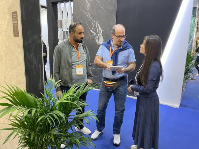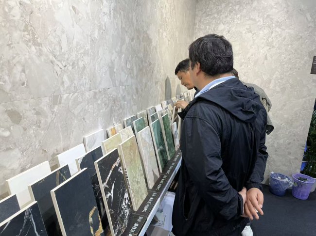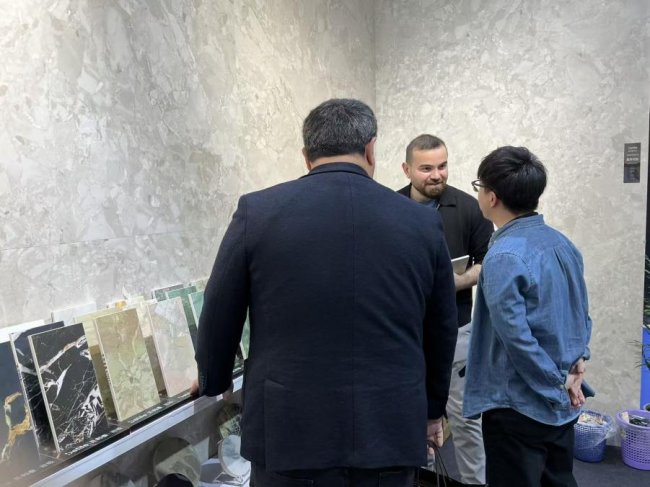 展会开幕首日,贝利泰A3048展位便迎来了一波又一波的海外客商。他们并非匆匆过客,而是在每一片岩板前俯身触摸、反复端详,与技术人员就釉面质感、坯体密实度等细节展开深度交流。