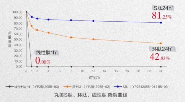 • 长效续航,稳定在线:得益于结构的升级,S肽的半衰期达到了天级。24小时后,它的保留量依然高达81.25%,稳定性是传统线性肽的24倍,实现了超长待机的呵护。