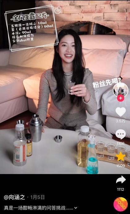 不止刘骏的日常 Vlog,朱正廷迎来 30 岁生日时,在生日主题照中与好友一起喝的是一见倾心,氛围感一整个拉满;还有之前刷到向涵之在快问快答视频里,游戏玩输了喝的也是五粮液一见倾心;还有赵奕欢元宵节用五粮液一见倾心调的【春和景明】和【莓有烦恼】,看起来就很好喝的样子。